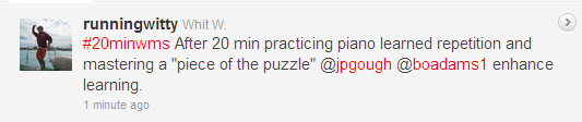 A quick report on our progress.  Today 12 faculty members and 3 students participated in our social media, learning and the brain, formative assessment project.  Actually 13 faculty members tweeted; we think that the missing tweets are from a faculty member with protected tweets; more problem solving tomorrow.  The BEST thing is that this faculty member wants her learners’ tweets to be “on the record.”