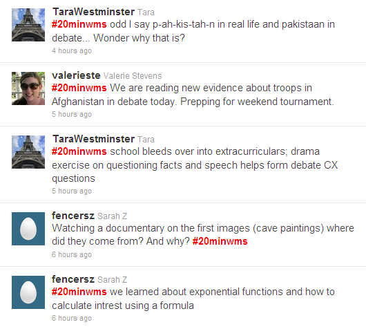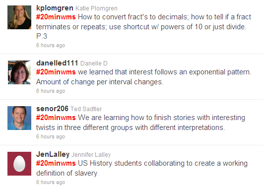 2. That middle school principal is more savvy than they think! How wonderful that a transition has already occurred – from dealing with mechanics of tweeting to seeing the connections among classrooms of learners. Fabulous progress.