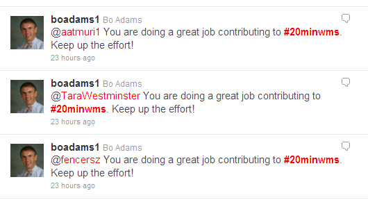 “You are doing a great job contributing to #20minwms. Keep up the effort!”