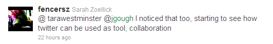 “I noticed that too, starting to see how twitter can be used as a tool, collaboration.” ~ @fencersz