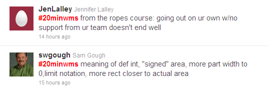 - When we search on the #20minwms hashtag, some tweets with this hashtag do not appear. It seems to skip a tweet or two from time to time. This is very frustrating to the tweeter and to the data collector.