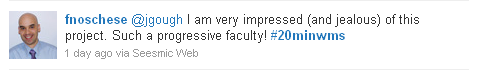 Today, there were over 80 tweets from 19 faculty members and 7 students that we know of. Some of our students have protected their tweets and two of our colleagues are still struggling to have their tweets appear when we search on our hashtag.