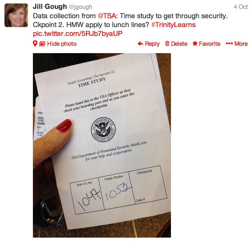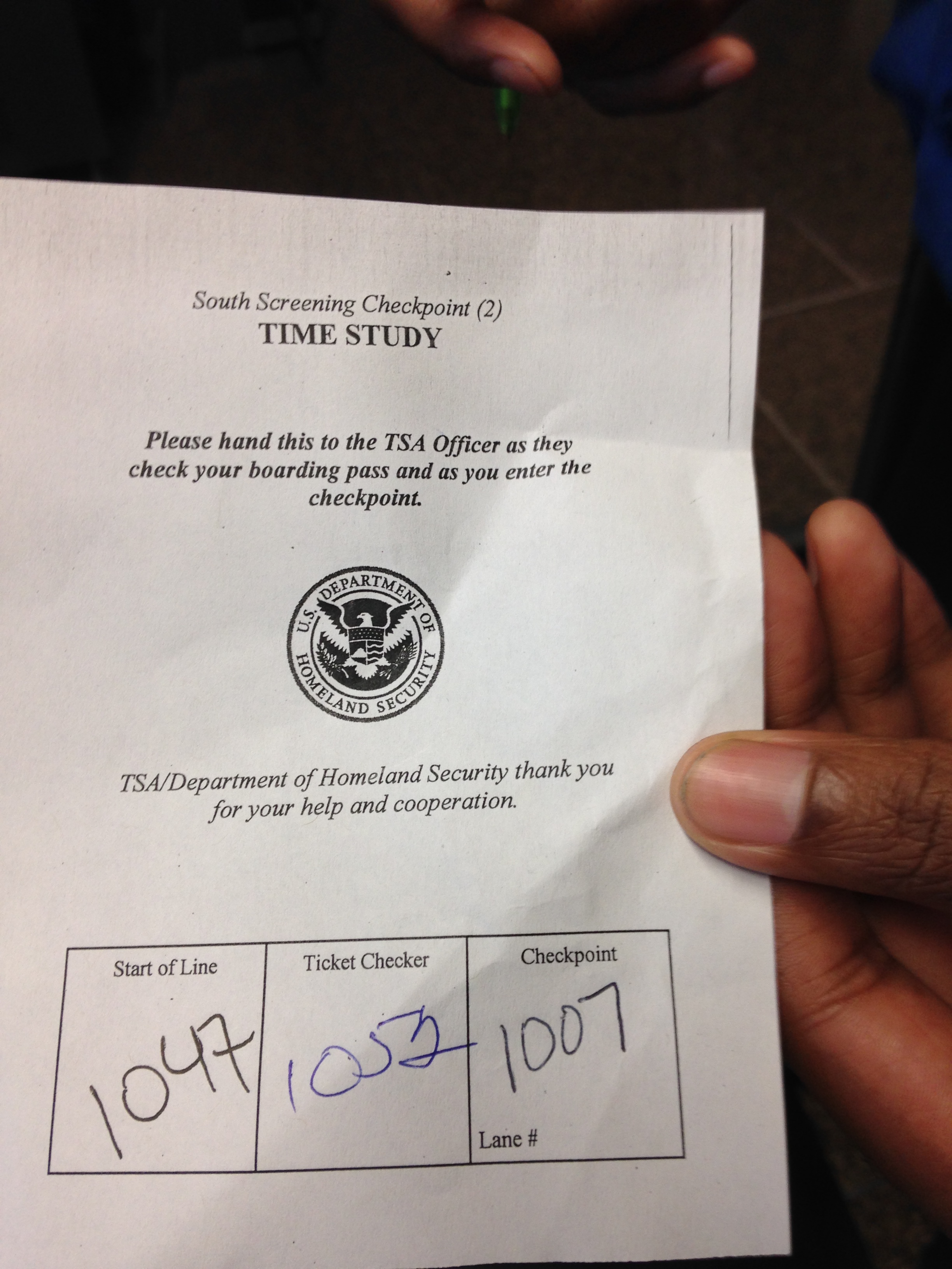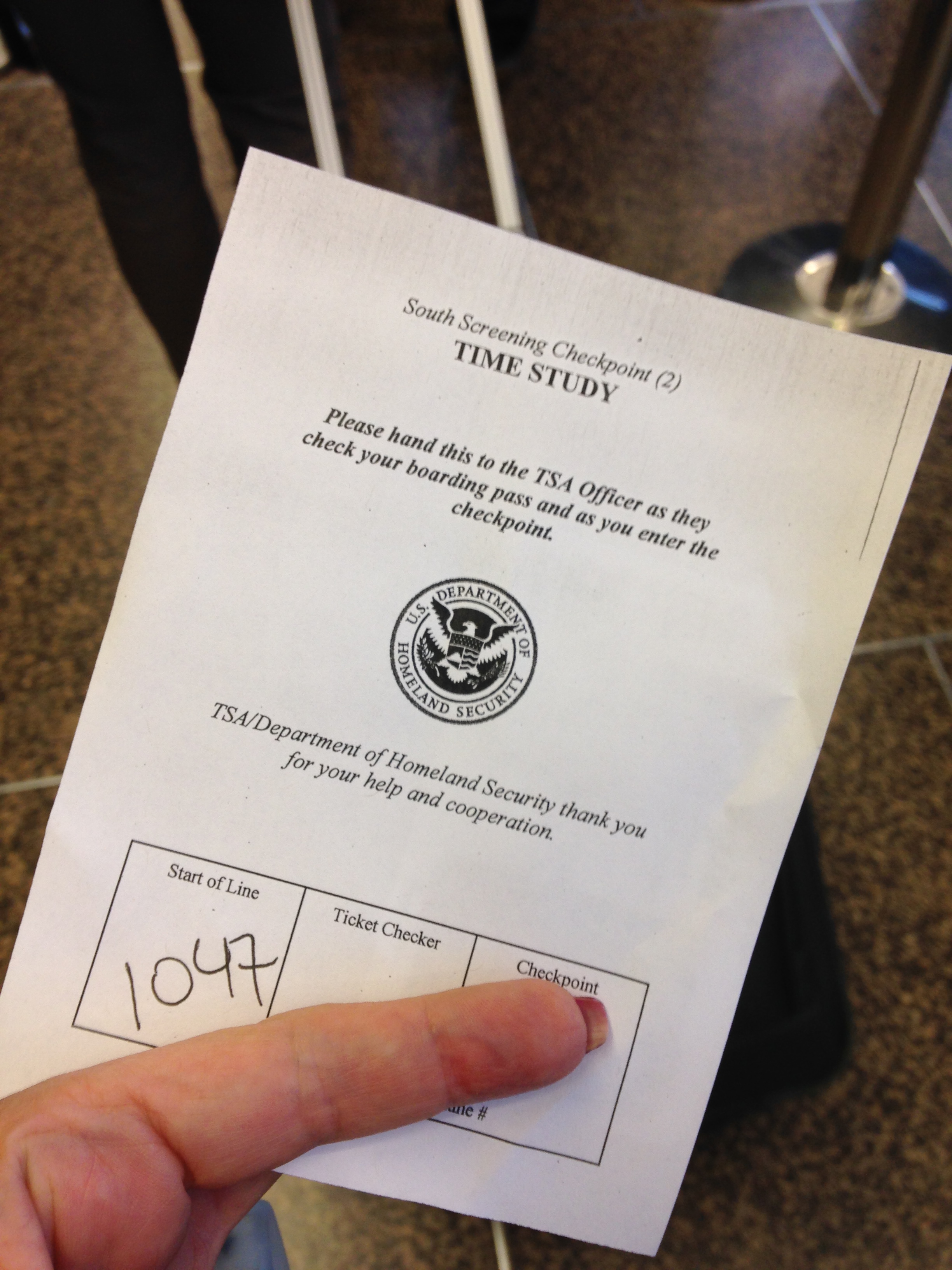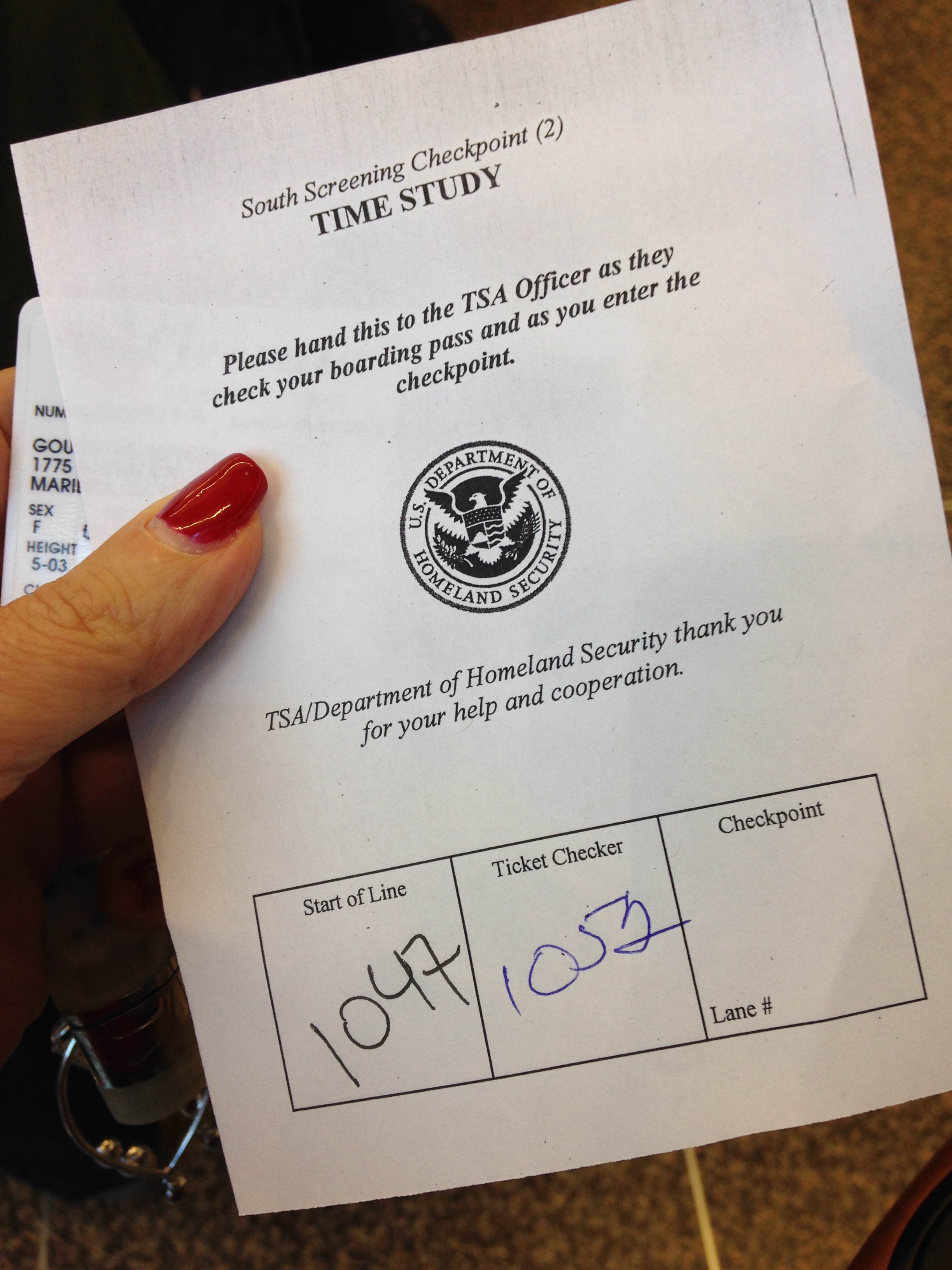 There’s one more stop before passing through security. My line – I always pick the slow one – stalled as the TSA representatives changed shifts. Again, I wondered if this felt longer than it really was taking. Holding the slip of paper allowed me to say to the nice but fidgety man in line ahead of me that we’d only been in line twelve minutes at this point. He said “Twelve minutes; that’s not so bad.” Ahh…to have data.