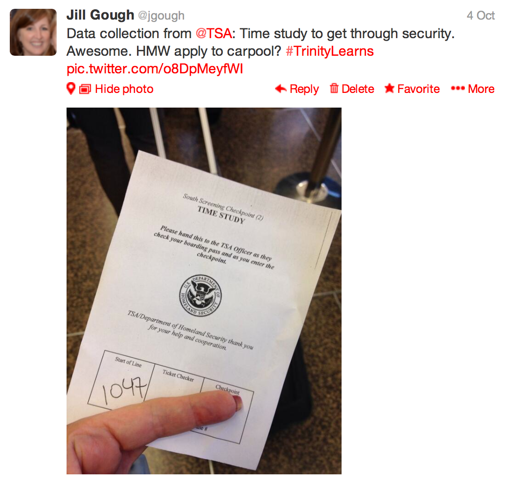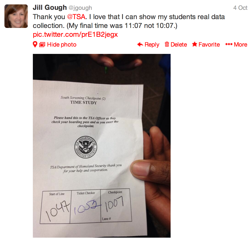 What if we used this method to collect data about carpool? Having the time I arrived at security told me how long I had been standing in line. I wonder if, when in a hurry, it feels like it takes longer to get through than it really takes.