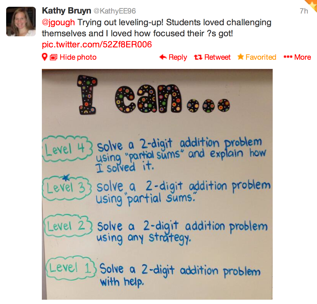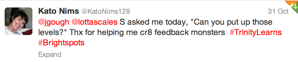 PD causes action. On Wednesday, October 30, we offered a session of Leading Learners to Level Up. The next day, Kato Nims (@KatoNims129) sent us a message that her 4th graders are asking for levels? We are creating feedback monsters! Awesome.