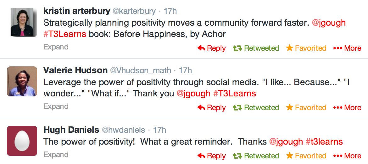 Jeff McCalla, @jmccalla1 and Confessions of a Wannabe Super Teacher, and I facilitated a session for T3 instructors on building and maintaining learning communites to learn, share, and support learning. Our lesson design, strategies, and resources are shared on the Developing a Virtual Learning Community Google doc. We were charged with the responsibility to lead a session for T³ instructors to brainstorm and share useful strategies to connect and learn from and with others. At the end of this session, our community should be able to say: