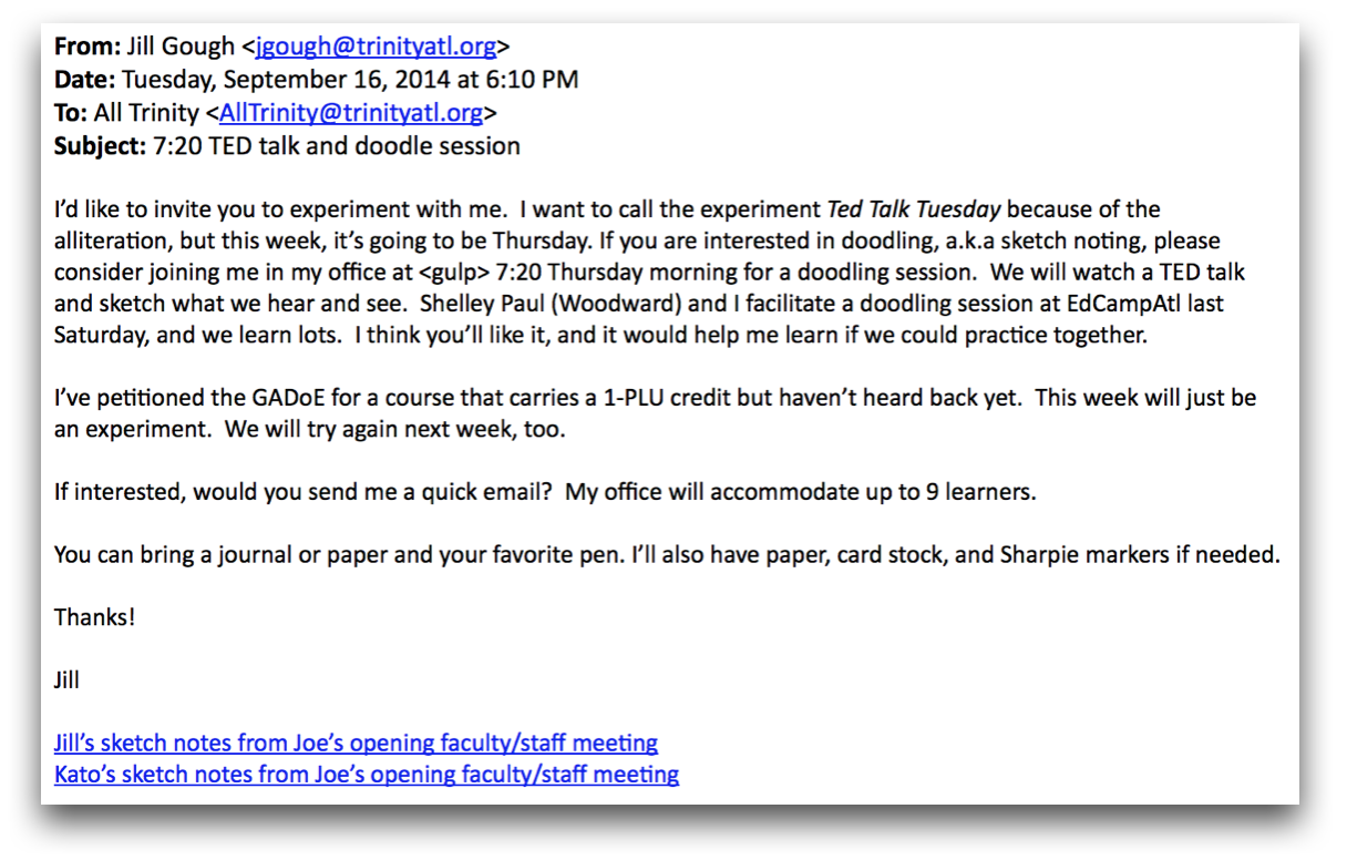 As you can see from the email above, Kato Nims and I have been experimenting with sketch noting or doodling to take visual notes since the beginning of the school year.