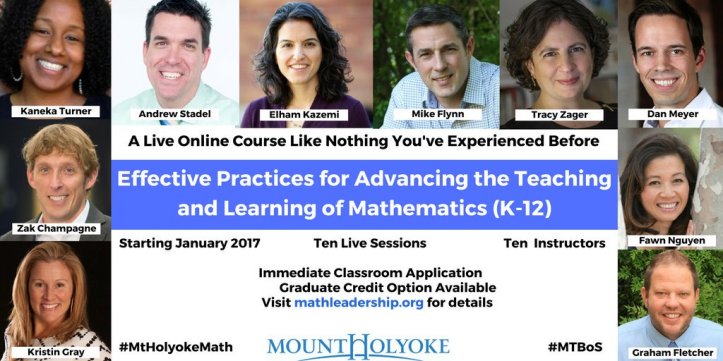 This primarily synchronous online course is designed to connect educators from across the country and around world to learn from some of the educational leaders in the Math/Twitter/Blogosphere (#MTBoS). Each class session will feature a different lead instructor who will guide us in exploring an effective practice for advancing the teaching and learning of mathematics. During these sessions participants will work collaboratively on mathematical tasks, analyze student thinking, explore instructional methodologies, and prepare to apply their new learning within their own practice.