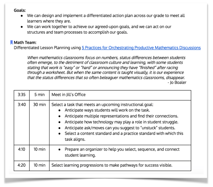 To anchor our work in differentiation and mathematical flexibility, we use NCTM’s 5 Practices for Orchestrating Productive Mathematics Discussions by Margaret Smith and Mary Kay Stein.