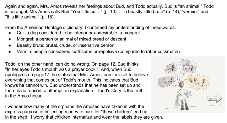 - I like that you included a sketch, because it helped me think about the names Bud was called. I wonder what Rule 118 is. What if you explain the connection to the text and your thinking?