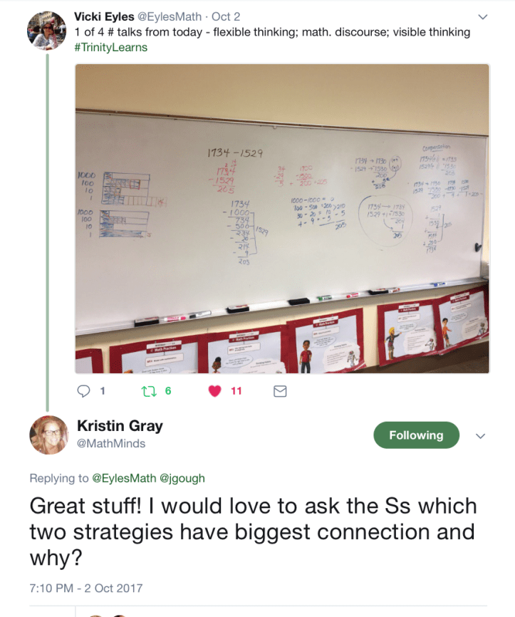 • Check out Kristin Gray’s (@MathMinds) response to Vicki’s tweet (shown below) and try to answer the question for yourself for a Number Talk you’ve done or will do this week.