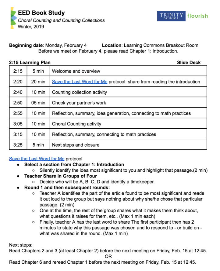 Prior to our first meeting on February 4, 2019, 16 teachers and administrators committed to learning together by studying the first chapter of Choral Counting and Counting Collections. The plan for the Feb. 4 meeting is shown at the end of this post and included time to discuss what we read as well as practice together.
