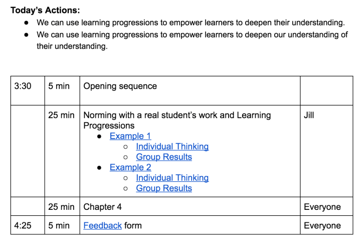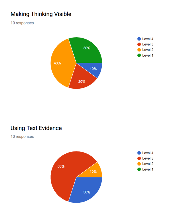 To ensure that all voices were heard, we started with quiet reading time and used a Google form (shown below) to record everyone’s initial thinking around the level of work based on the given learning progressions for Making Thinking Visible and Using Text Evidence.