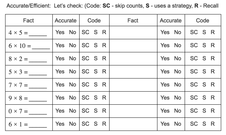 Section 2 checks for accuracy and efficiency.  The teacher will code the student’s response as recall, uses a strategy, or skip counts.  The first 8 facts are common for all students. The next 8 facts can be customized for each student based on their responses to easiest and hardest.
