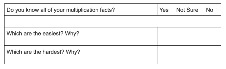 Section 1 asks students if they know their multiplication facts. We intentionally ask these questions because of John Hattie’s work on student expectations of self – effect size of 1.44.