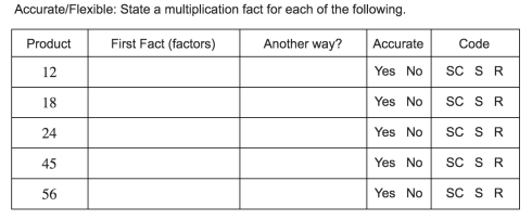 Section 3 checks for accuracy and flexibility.  In the previous section, the teacher gave the multiplication expression and the student responded with the product.  Now it is reversed. The teacher gives the answer and student states an expression and are asked if they know another way.