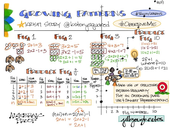 Day 1’s Task is modified from Fawn Nguyen‘s Visual Patterns, pattern #10 puppies. Starting as a simple number talk, how many do you see and how do you see them?
