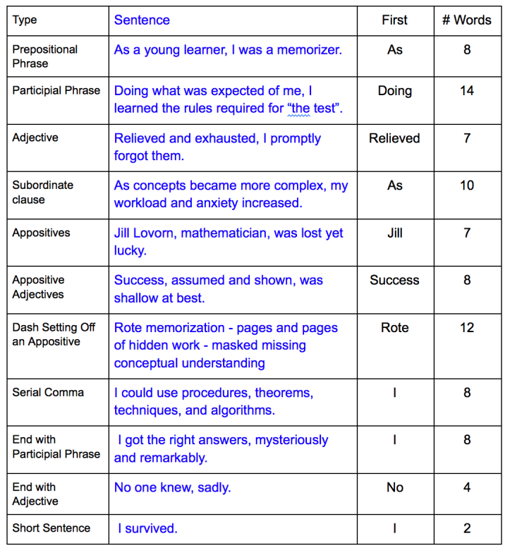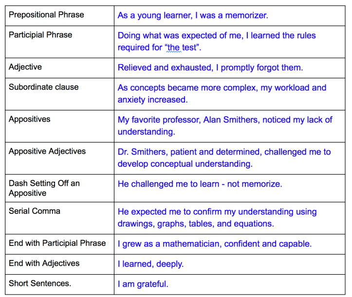 Intent on learning more about sentence variation, my feedback partner helped me notice that I begin many of my sentences with nouns. Challenged to play more with my writing, I assigned myself the task of writing an 11 sentence paragraph using each of Anderson’s 11 Sentence Pattern Options from Chapter 8, Energy.