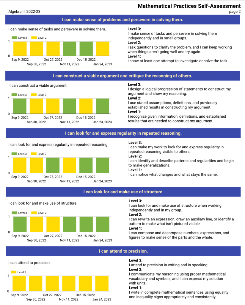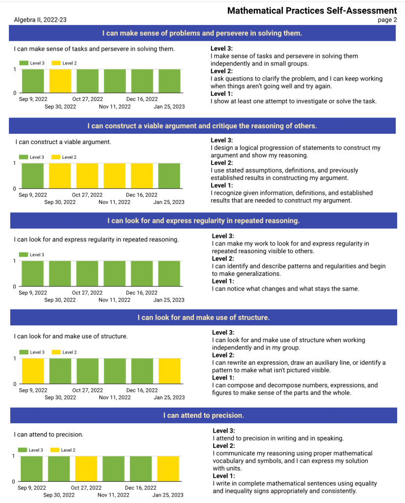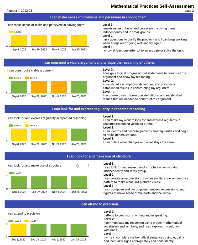 Below are students’ reflections on their progress. (I’ve removed the name of the student.) Each student has different strengths and needs. What if we intentionally group students so that they grow as practitioners of mathematics?