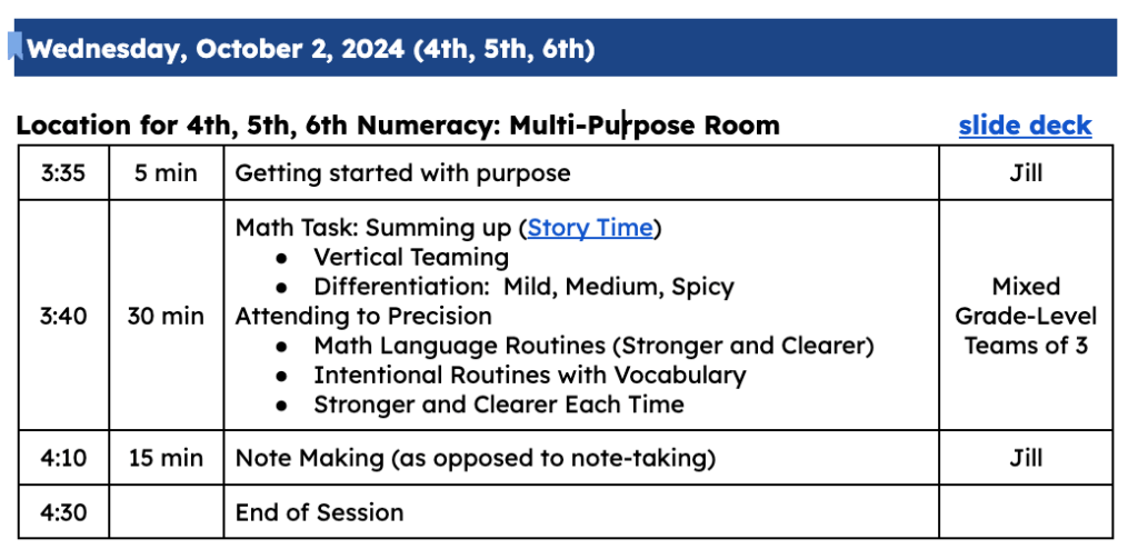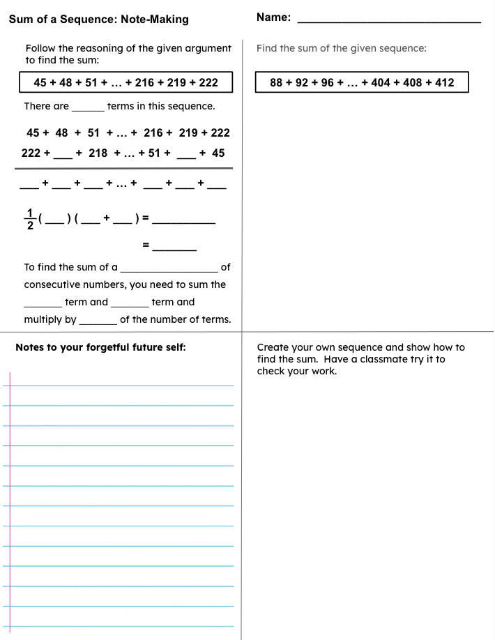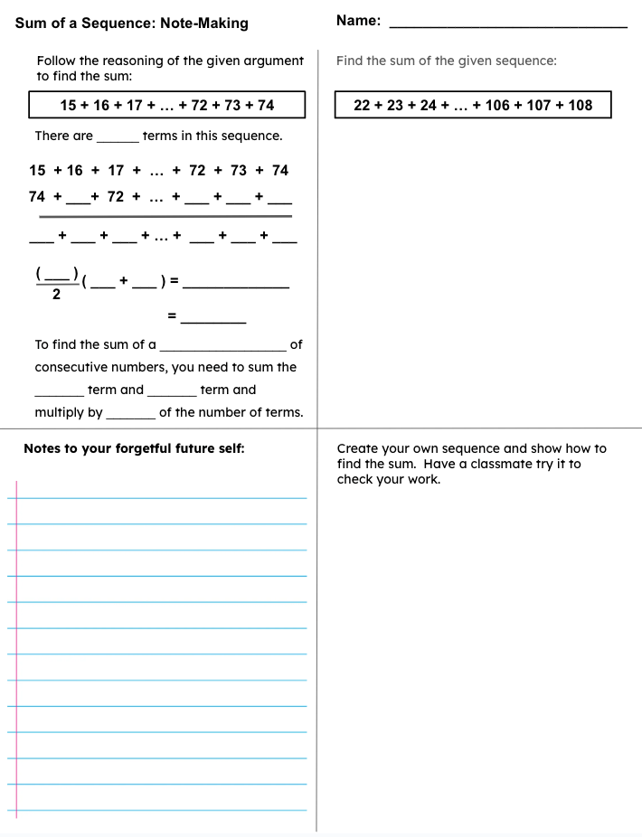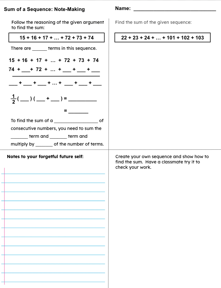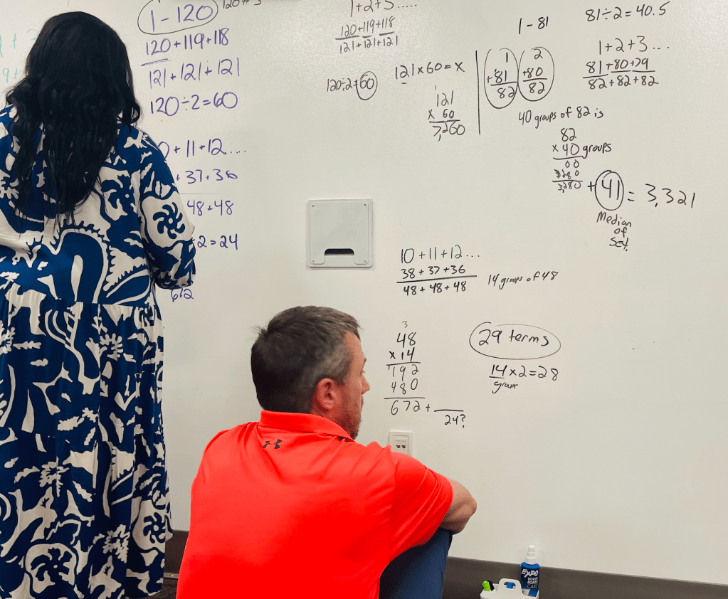 I embellished the story of Gauss and his teacher to have our teachers find the sum of consecutive natural numbers from 1 to 100. Now, mathematically this is an algebra or pre-calculus topic, but it is also adding whole numbers, making use of structure, and looking for regularity in repeated reasoning. So, there is the possibility that these teachers will find this mathematics unfamiliar.