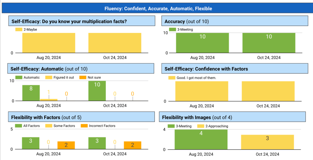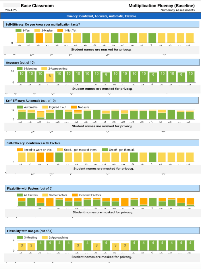 Our 4th, 5th, and 6th-grade mathematics teachers are committed to strengthening mathematical fluency in multiplication. At the beginning of the year, as a team, we work to assess our learners’ confidence and self-efficacy along with conceptual and procedural understanding of multiplication. We ask; they tell us. We spot-check to see if what they tell us matches their performance. Here’s what one class of students’ results looks like.