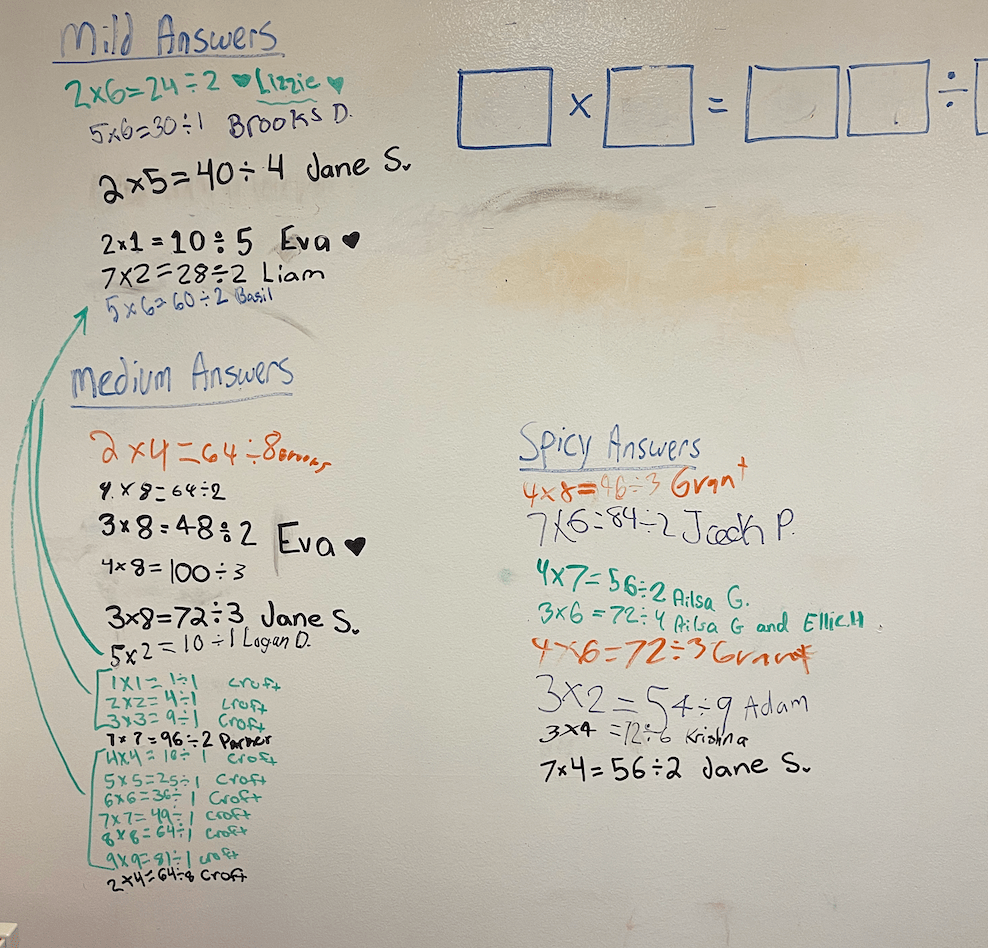 Early in the week, Vicki Eyles popped in to let us know an unanticipated benefit of the reframe with mild-medium-spicy is that many more students are contributing to the collective list of solutions. Let’s repeat that! Many more students – different students – are engaged in the task, in the public posting of good mathematics.