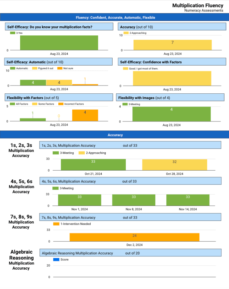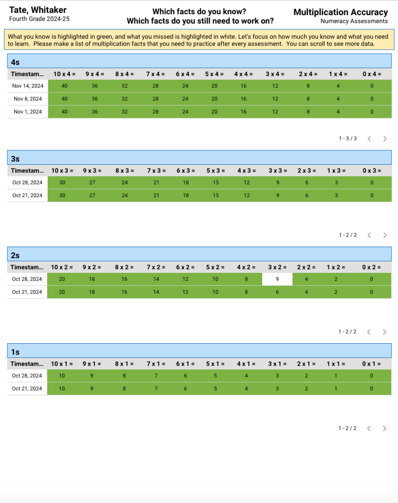 Let me back up. A couple of weeks ago, Kerry Coote, Trinity’s Mathematics Instructional Specialist, wished we would empower our students to take more action and more responsibility for their learning. Up to this point in our multiplication fluency assessments, students and teachers had this view of outcomes.