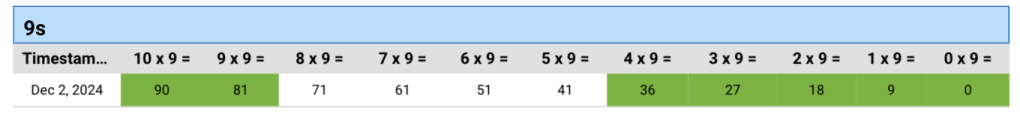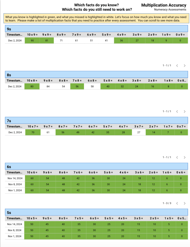 Yes, that is correct! This student knows a lot of their multiplication facts. If it is highlighted in green, it is correct. Did you notice what is happening with the 9s? Sarah Mokotoff, UED Learning Specialist, and this student did!