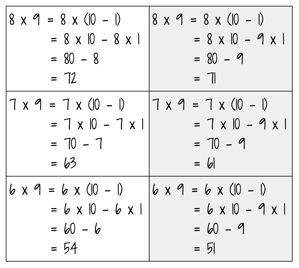 The four missed facts all have a 1 in the one’s place. Hmm… What was WT thinking? WT is using the strategy round-and-adjust. WT knows that 9×10=90. So 9×9, using round-and-adjust, becomes (10-1)x9 which is 10×9-1×9=81.